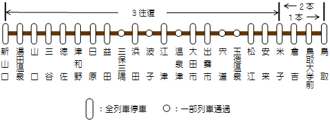 特急スーパーおきの場合、止まる停車駅の「規則性」はかなり複雑で、どの列車がどの駅に止まるか、よく調べないと分かりにくいです。止まらない列車がある5駅で乗り降りするならご注意を。